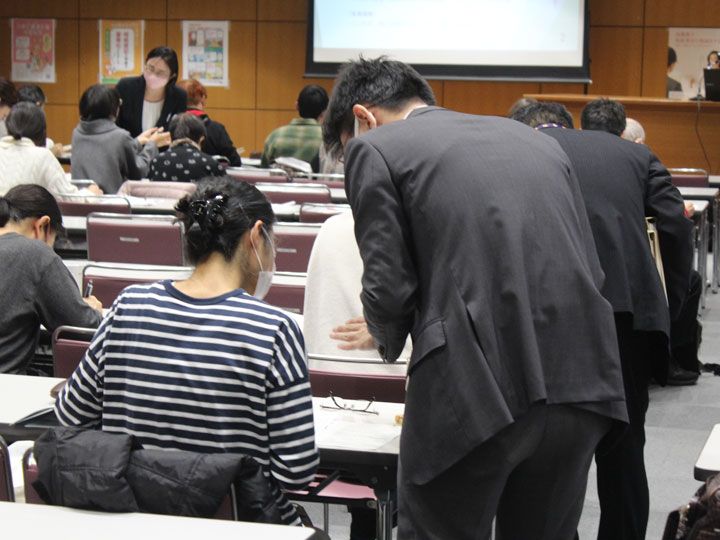 体験会で作成する遺言書に記載する財産の内容などは、体験会用にあらかじめ設定した共通の内容とされていましたが、参加者は、それぞれの親族を思い浮かべながら司法書士や法務局職員などから具体的な助言を受け、熱心に遺言書を作成する工程を体験していました。