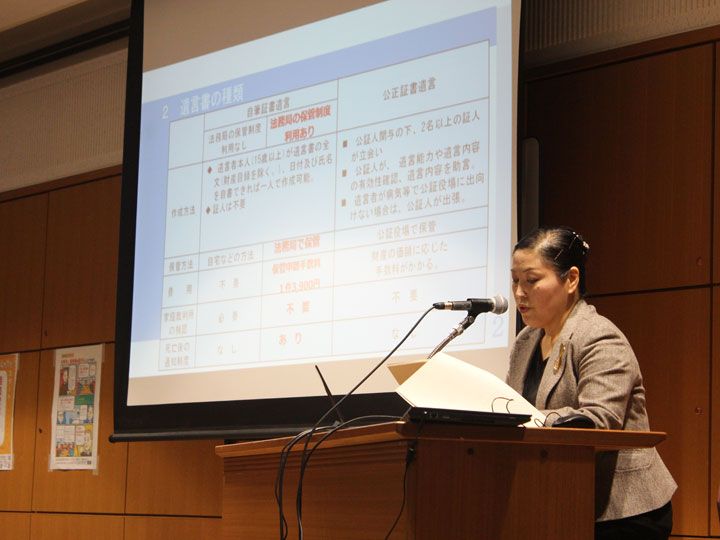 第1部では、愛知県司法書士会理事である司法書士の杉浦真智子氏が登壇し、「相続や遺言の基礎知識」について講義を行いました。